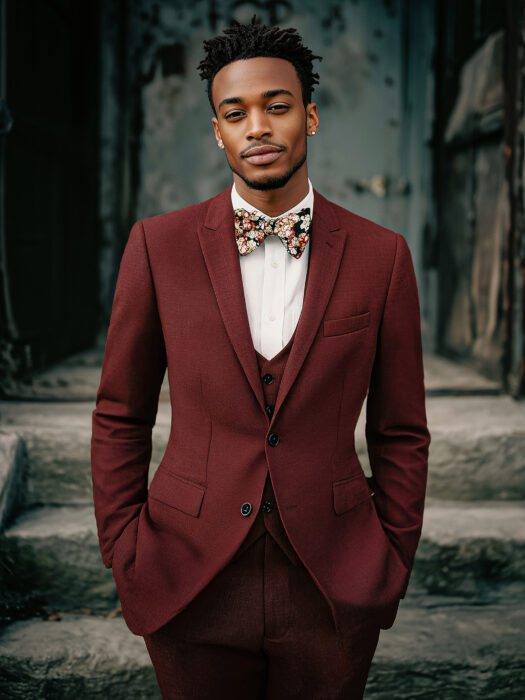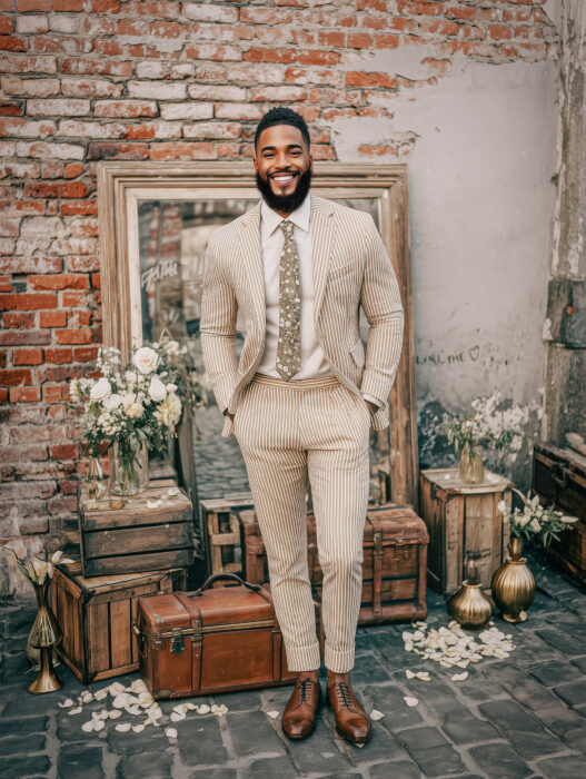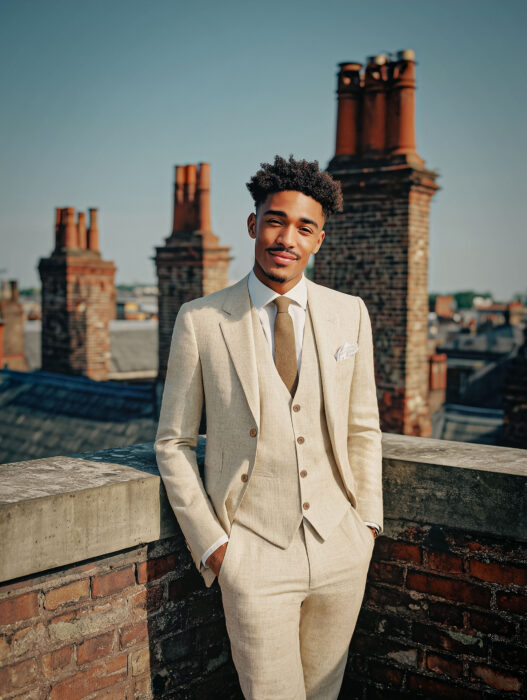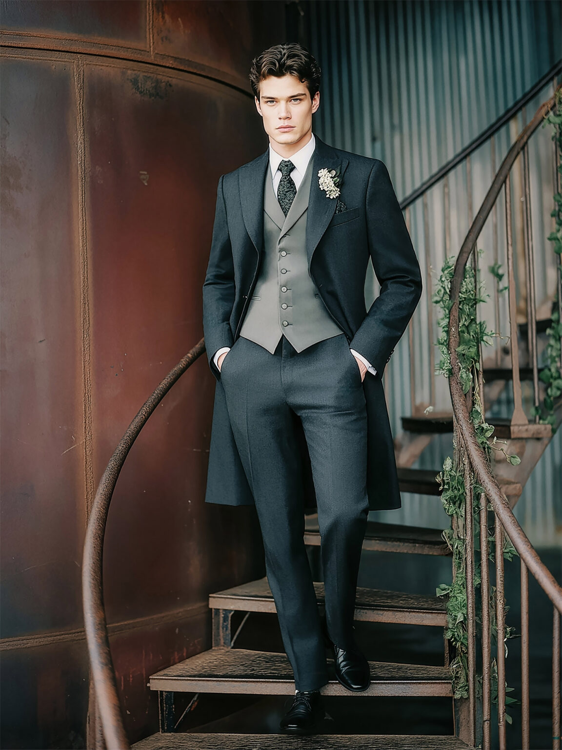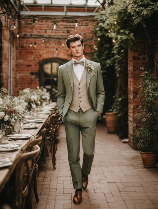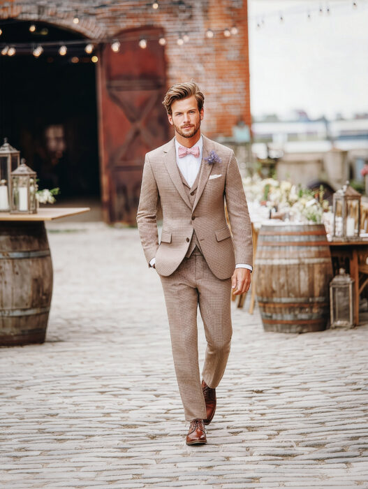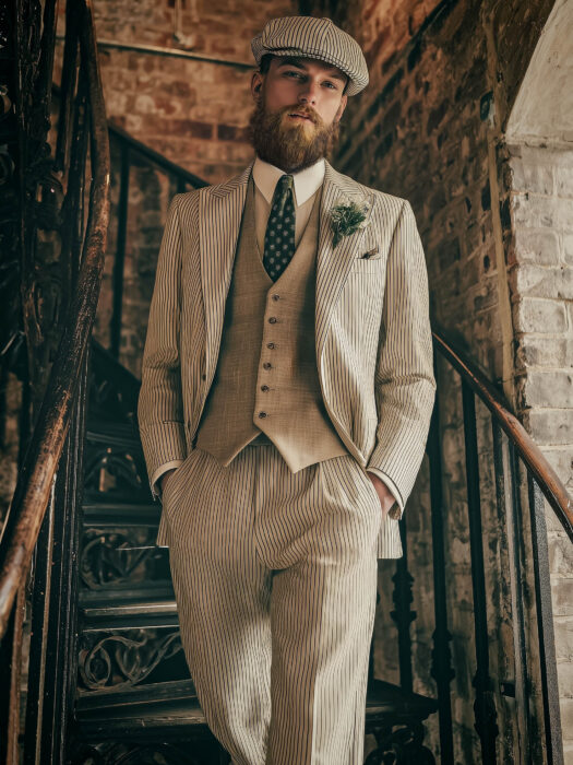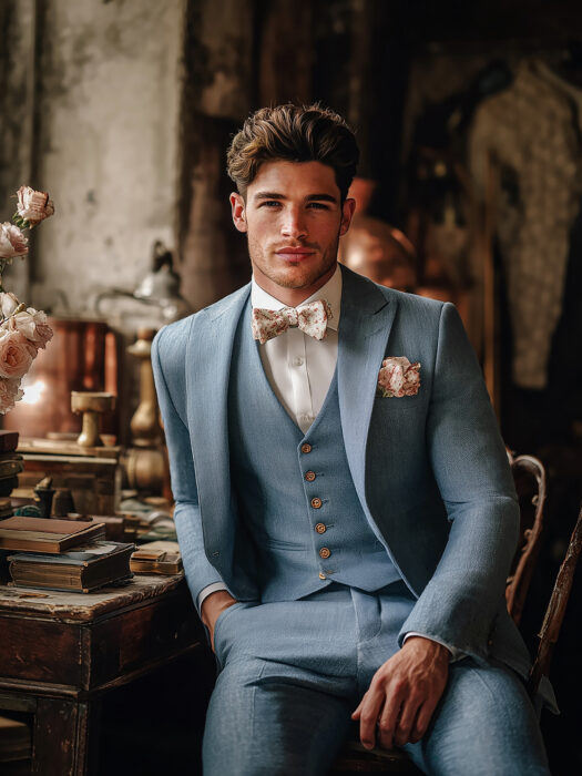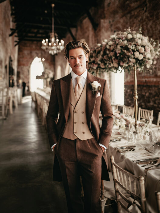 Le costume trois pièces, avec son gilet assorti, est une véritable signature du style britannique. Il apporte une dimension formelle et raffinée, parfaitement adaptée aux mariages vintage et aux cérémonies élégantes.