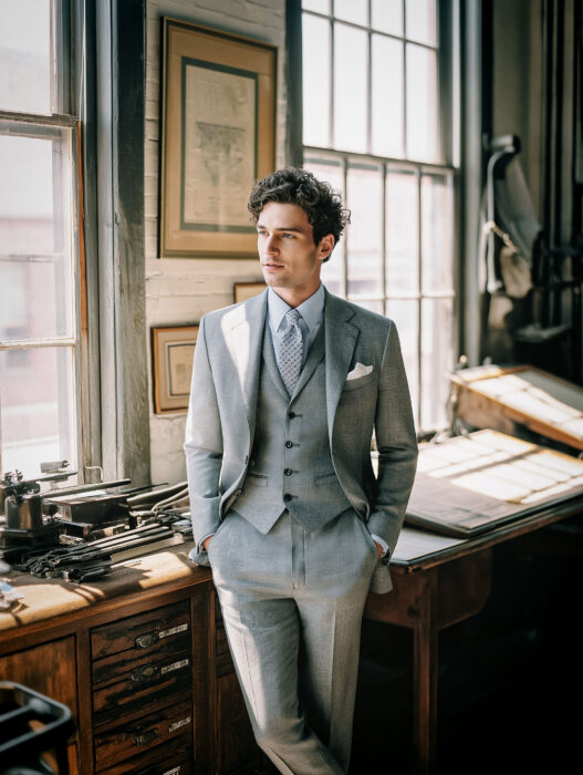 Je conçois ces costumes comme des pièces de caractère : lainages texturés, gilets inspirés des archives britanniques, coupes structurées qui sculptent la silhouette tout en conservant cette dimension rétro si séduisante. Les images qui accompagnent cette collection évoquent un univers romantique, presque cinématographique, où la nostalgie se mêle à la modernité avec fluidité.
