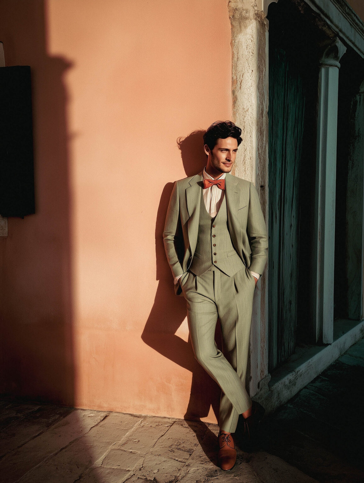 - Costume croisé ou redingote vert sauge, pour un style classique et cérémonial.